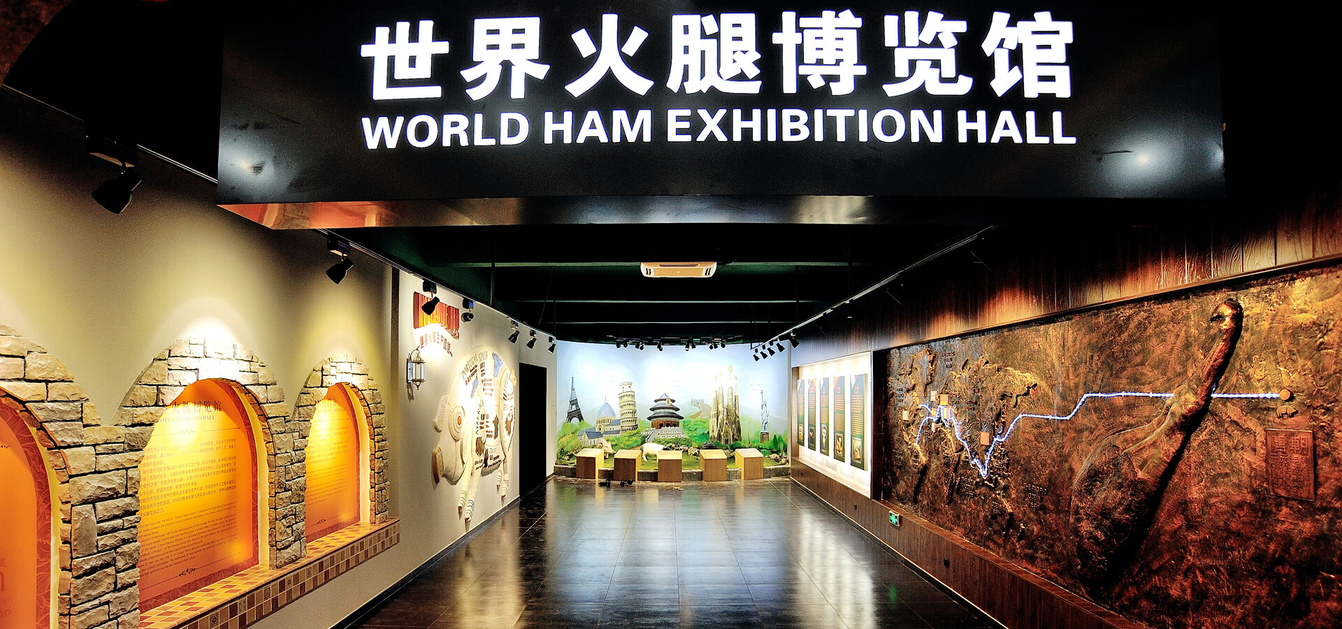 世界火腿博览馆是一个以世界火腿为主题的博览馆,用历史-地域-工艺-文化为线索,通过展板、照片、声光和布景等手法,翔实介绍了中国金华火腿、西班牙伊比利亚火腿、意大利帕尔玛火腿、法国科西嘉火腿和巴黎火腿、美国的乡村火腿等世界知名火腿的历史人文,消费习俗、制作工艺、火腿美食等。